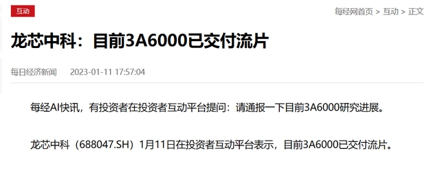 近日,在投資者互動(dòng)平臺(tái)上,有人咨詢關(guān)于3A6000芯片的研究進(jìn)展問題,龍芯中科回復(fù)表示:目前3A6000已交付流片。這說明,國(guó)內(nèi)下一代CPU首款芯片,基于自主化設(shè)計(jì),目前已經(jīng)完成了研發(fā)。